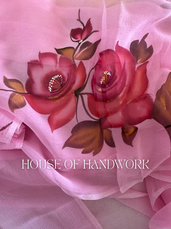 Midnight Bloom Foil Work Hand Painted Chiffon Saree