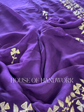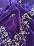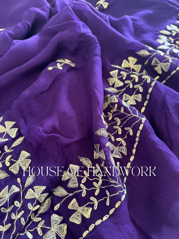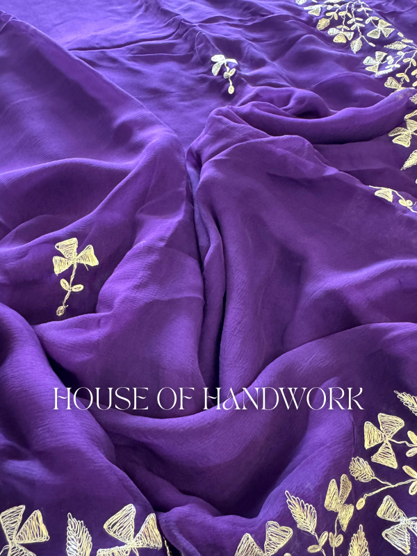 Delicate golden handwork embroidery with intricate leaf and vine motifs trails gracefully across the fabric, creating a mesmerizing contrast against the deep purple base. The fine detailing shimmers subtly with every movement, making it an ideal choice for both day and evening occasions.