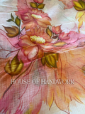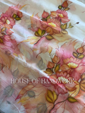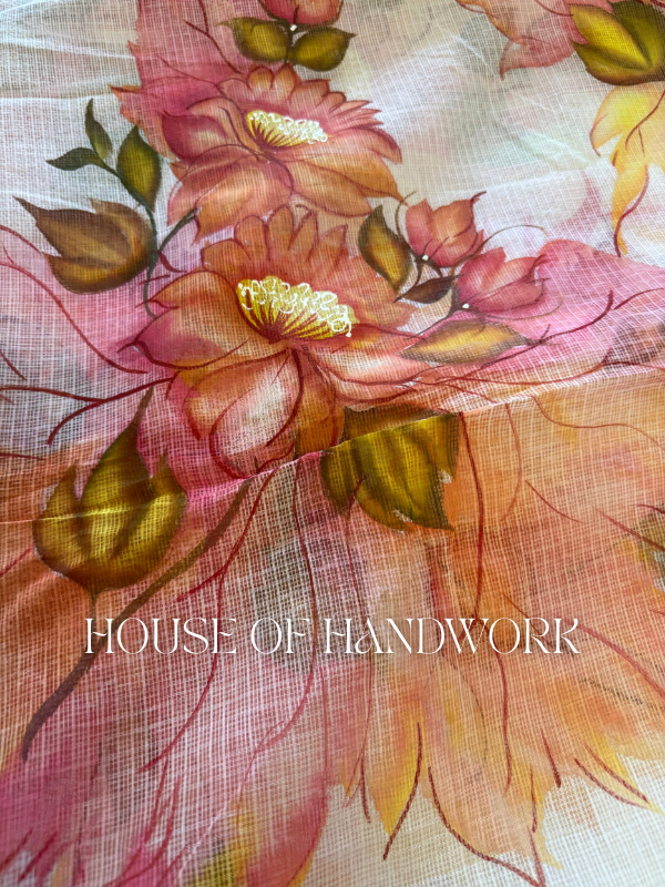 Celebrate artistry and tradition with our Blush Lotus Hand Painted Kota Doria Saree, a masterpiece of elegance and charm. Crafted from airy Kota Doria fabric, this saree features a soft ivory base adorned with hand-painted lotus blooms in shades of blush pink, peach, and golden yellow. The lush green leaves and intricate brush strokes add depth, giving the drape a graceful, painterly appeal.