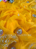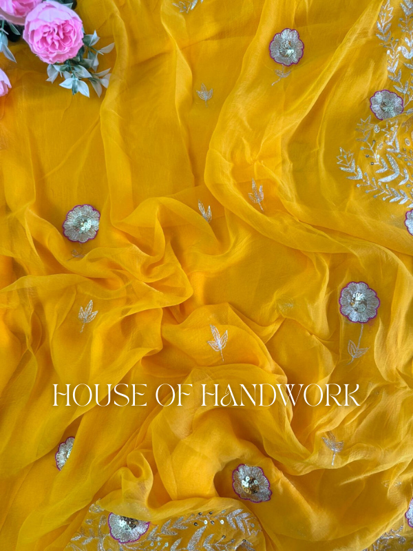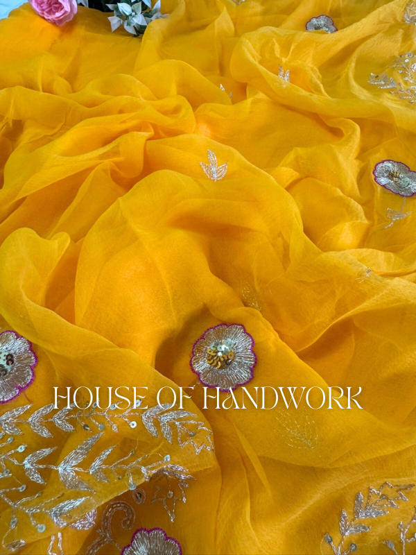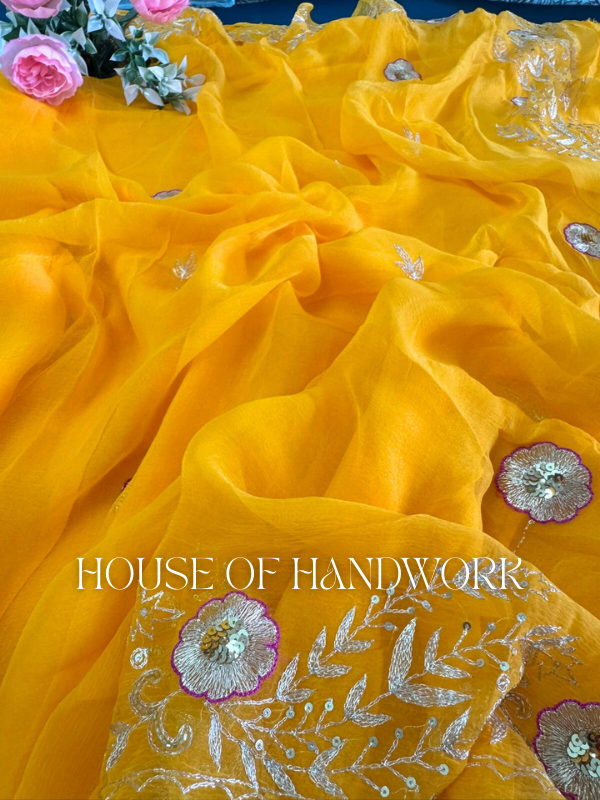 Adorned with delicate star-inspired sequin embroidery in shimmering gold and silver, each motif sparkles with understated glamour, adding a celestial charm to this airy drape. The lightweight chiffon fabric ensures graceful movement and all-day comfort, making it as practical as it is enchanting.