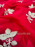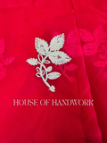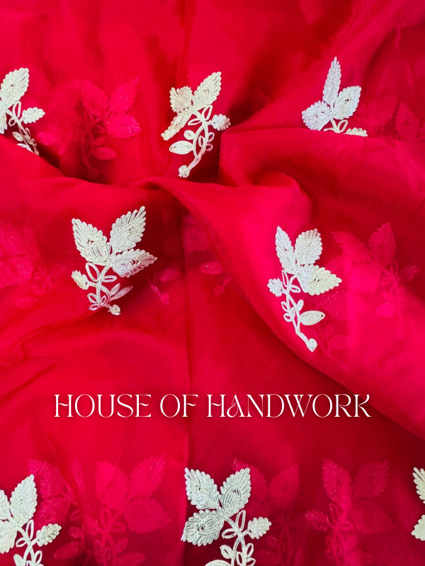 Step into timeless elegance with the Crimson Leaf Gota Organza Saree, a masterpiece that embodies grace and tradition. Crafted from airy organza, this saree is adorned with delicate gota work in elegant leaf motifs, radiating sophistication and charm. The rich crimson base enhances the shimmer of the golden embroidery, making it a perfect blend of luxury and artistry.