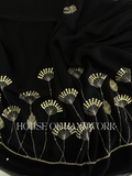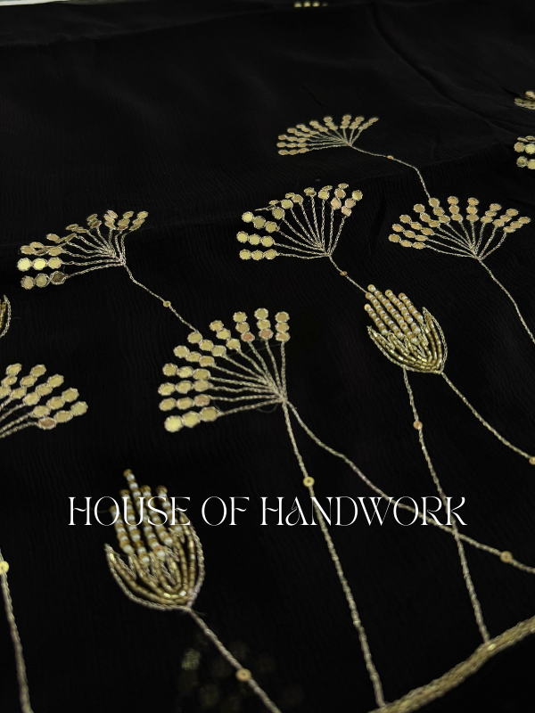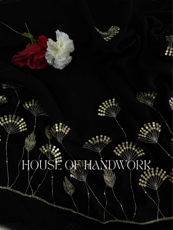 Step into timeless sophistication with the Ebony Glow Chiffon Handwork Saree. Draped in a deep black chiffon base, this saree radiates elegance and grace, making it a statement piece for any special occasion. The rich black backdrop is beautifully adorned with delicate hand-embroidered motifs in shimmering gold, creating a striking contrast that exudes luxury.