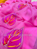 Step into the spotlight with the Fuchsia Feather Foil Handpainted Saree, a masterpiece that blends artistic hand painting with the radiance of foil work detailing. The vibrant fuchsia base serves as a striking canvas, while graceful feather motifs are brought to life through meticulous brushstrokes and shimmering foil accents.
