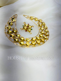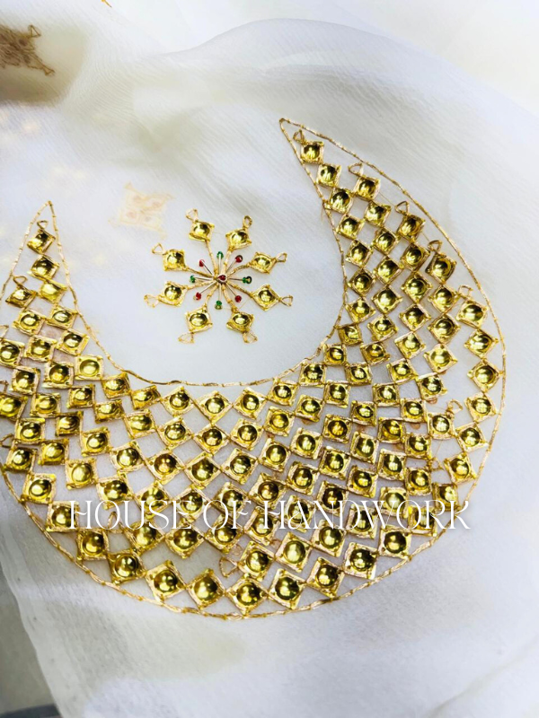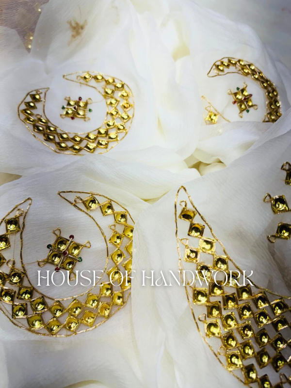 Embrace celestial elegance with the Golden Crescent Danka Chiffon Saree, a masterpiece that blends tradition with timeless artistry. Crafted on a soft ivory chiffon base, this saree is adorned with exquisite golden danka handwork, forming delicate crescent moon motifs and intricate geometric patterns. Each shimmering detail reflects light beautifully, creating an ethereal aura of sophistication.
