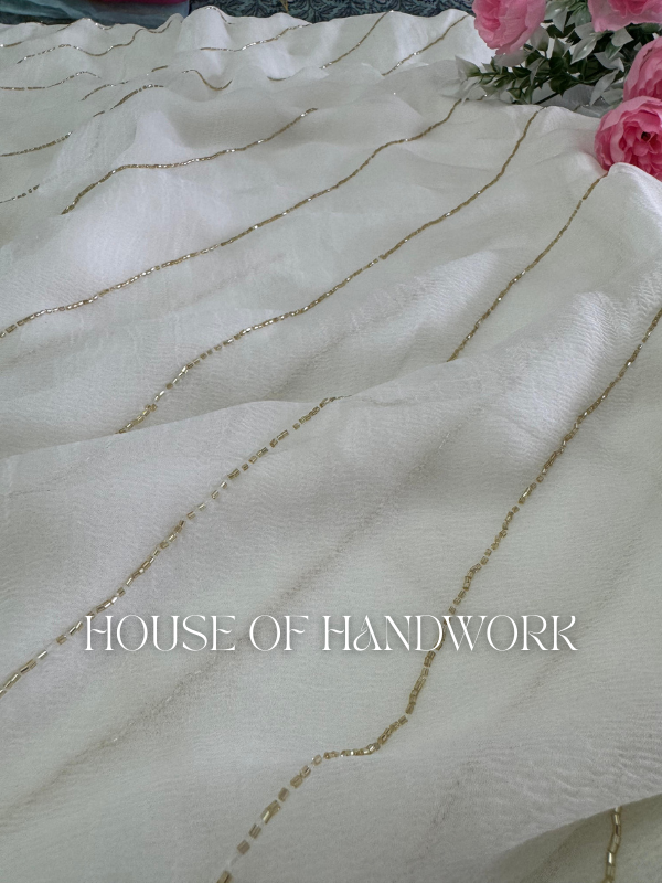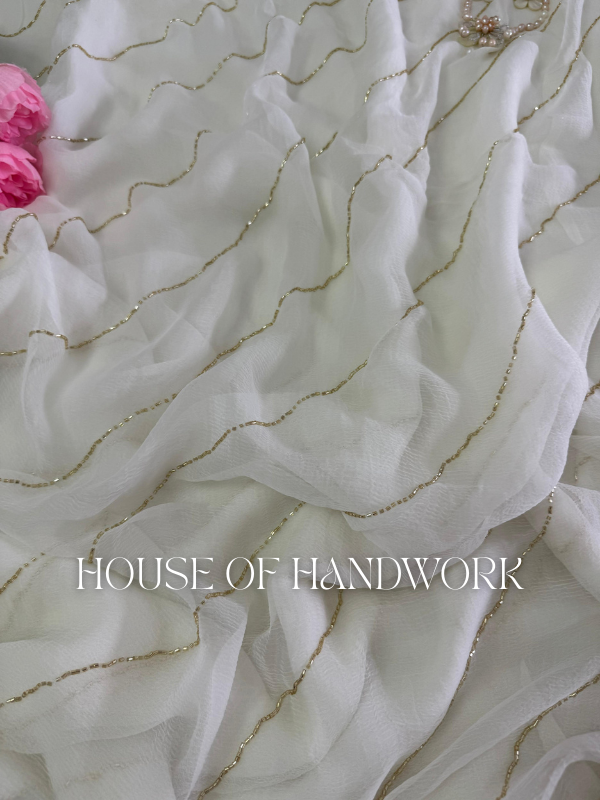 Grace your festive and special occasions with the Ivory Glow Handwoven Chiffon Saree. Designed on a soft ivory base, this lightweight chiffon drapes beautifully while offering effortless comfort. The saree is adorned with delicate handwoven golden diagonal lines, adding a subtle shimmer that enhances its understated elegance. Minimal yet sophisticated, this handcrafted saree is perfect for weddings, festive gatherings, and evening celebrations, making it a timeless choice for those who appreciate refined style.