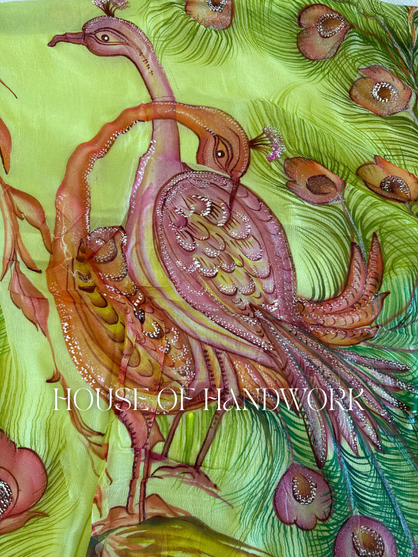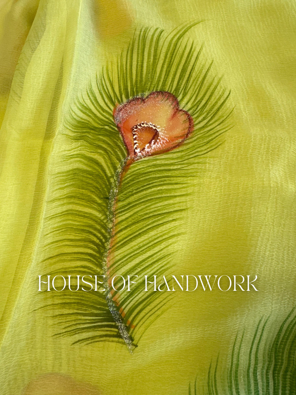 Lime Radiance Peacock Hand Painted Saree