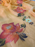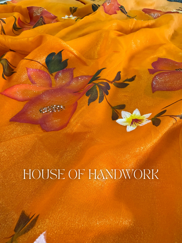 Wrap yourself in the vibrant beauty of the Marigold Charm Hand Painted Saree. With its rich golden-orange base, this saree is brought to life through bold hand-painted floral motifs in warm red and soft yellow tones. Each petal is carefully detailed, creating a lively contrast that radiates festive elegance.