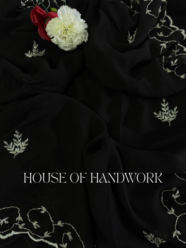 Turn every occasion into a statement with our Midnight Spark Sequence Handwork Chiffon Saree. Crafted from airy chiffon in a rich black hue, this saree is adorned with delicate sequence handwork and floral butta motifs that shimmer gracefully under light. The intricate detailing of golden swirls and sequins brings a touch of glamour while maintaining timeless elegance, making it a perfect pick for evening parties, festive gatherings, and wedding celebrations.