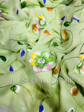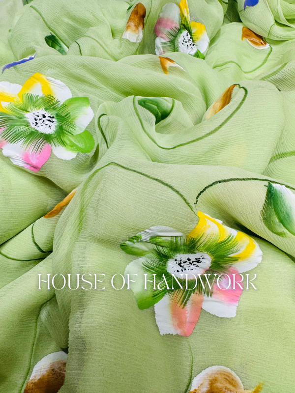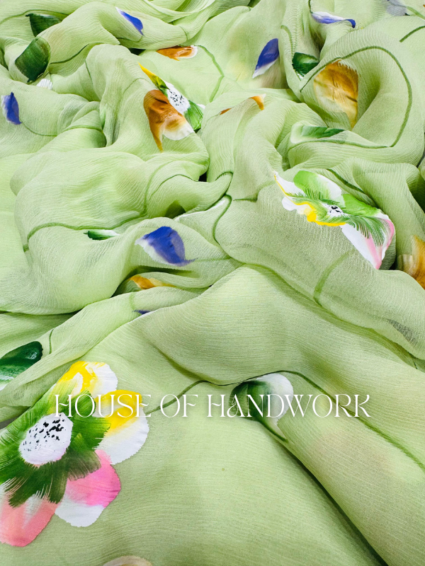 Celebrate nature’s freshness with the Olive Garden Handpainted Saree. Crafted on a soft olive-green chiffon base, this saree blooms with hand-painted floral artistry in vibrant hues of pink, yellow, blue, and white. Each flower is delicately brushed by skilled artisans, making every drape a unique canvas of elegance.