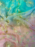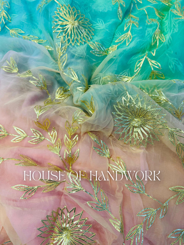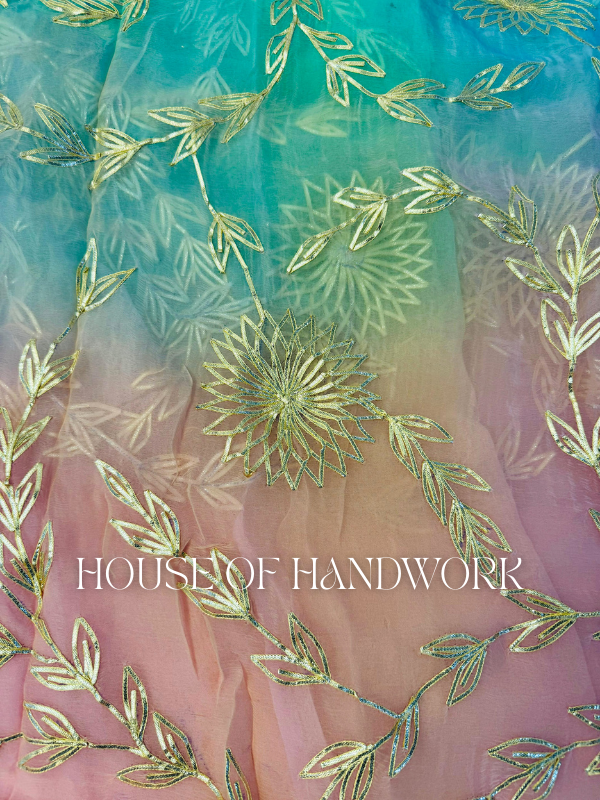 Step into timeless elegance with our Pastel Horizon Gota Work Chiffon Saree, a delicate drape that blends artistry with tradition. Handcrafted in airy chiffon, this saree features a dreamy ombré transition from serene aqua to soft blush, adorned with intricate golden gota embroidery. The shimmering floral and leaf motifs add a festive glow, making it perfect for weddings, celebrations, and evening soirees.