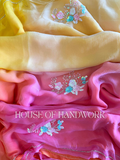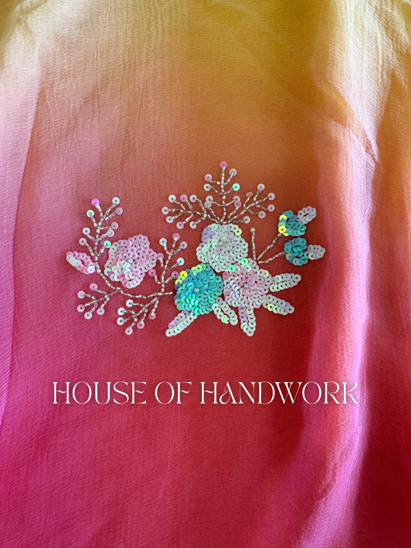 Radiate charm and grace with the Peach Blossom Glow Chiffon Saree. This elegant drape beautifully blends soft peach and blush pink tones, creating a serene pastel palette reminiscent of a glowing spring sunrise. Adorned with delicate handwork floral motifs in sequins and thread embroidery, the saree sparkles with subtle sophistication.