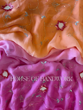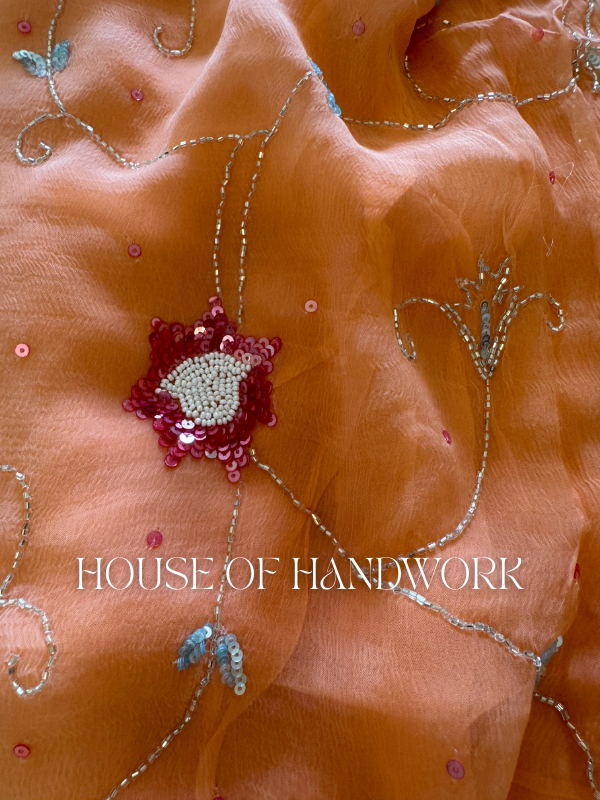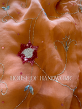 Celebrate grace and sophistication with the Peach Rose Radiance Handwork Saree. Designed on a dual-toned base of warm peach and delicate rose pink, this saree exudes a soft radiance that is perfect for festive and elegant occasions. Adorned with intricate sequin and pearl hand embroidery, the floral motifs shimmer beautifully with every movement, creating a captivating charm.