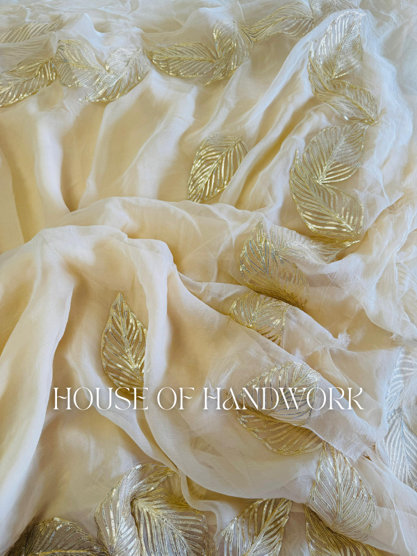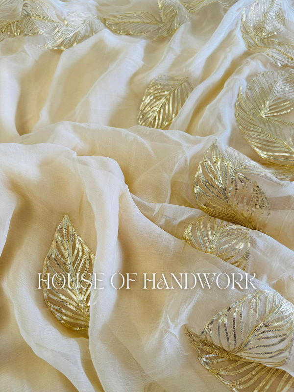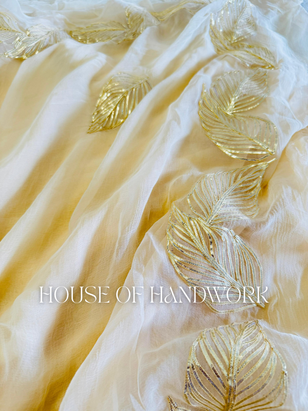 Embellishment: Hand-done golden gota embroidery with leaf motifs