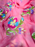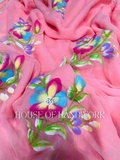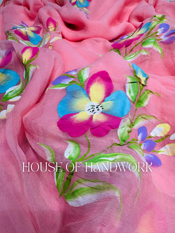 Step into elegance with the Petal Garden Handpainted Saree, a stunning drape that blends soft artistry with timeless grace. Crafted from airy, flowing fabric, this saree features handpainted floral motifs in vibrant hues of pink, blue, yellow, and green, creating a garden of blossoms across its canvas.