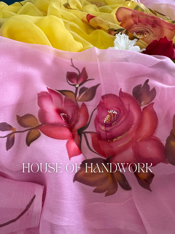 Step into timeless elegance with the Petal Glow Hand Painted Saree. Designed on a soft pink base, this saree blooms with beautifully hand-painted roses in deep crimson and magenta, highlighted with golden shimmer accents. The delicate strokes and graceful floral details bring a sense of charm and sophistication to your look.