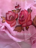 Color: Soft pink base with crimson hand-painted roses