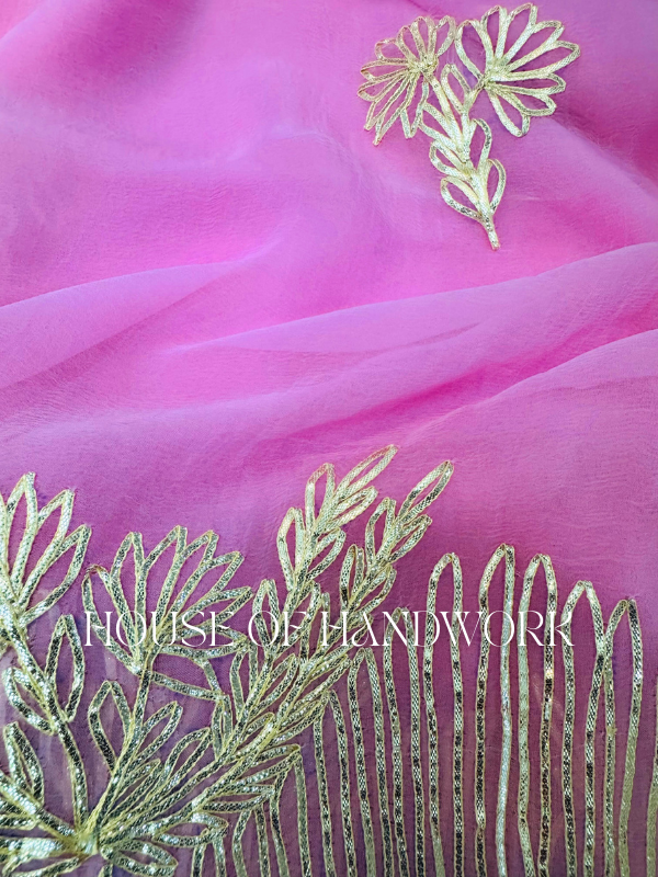 Brighten your celebrations with the charm of our Pink Blossom Gota Work Chiffon Saree, a perfect blend of elegance and vibrance. Crafted in premium chiffon, this saree features a vivid fuchsia-pink base beautifully adorned with golden gota embroidery in floral and leafy patterns. The striking blossoms stand out against the rich pink backdrop, creating a radiant look ideal for festive occasions and grand celebrations.
