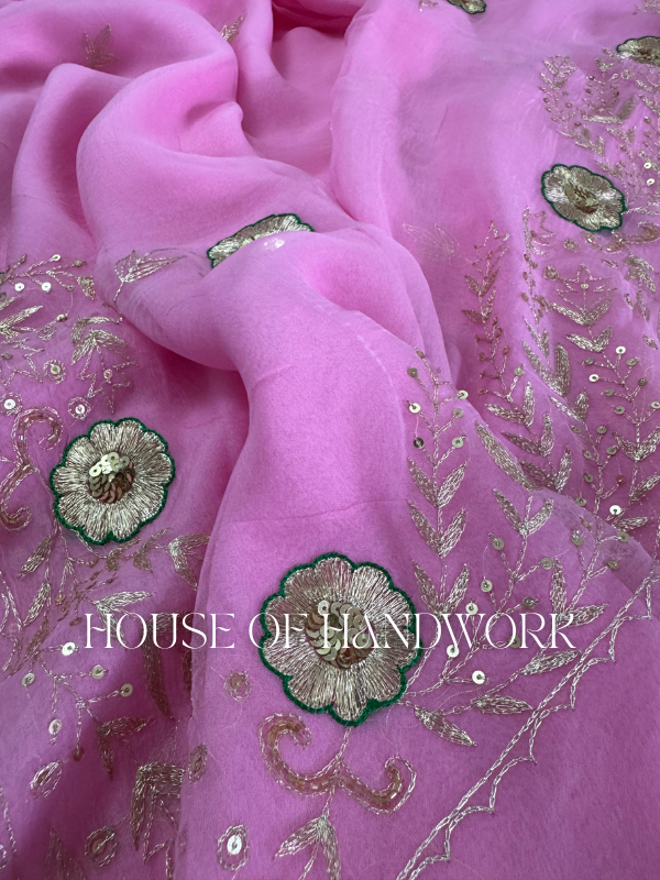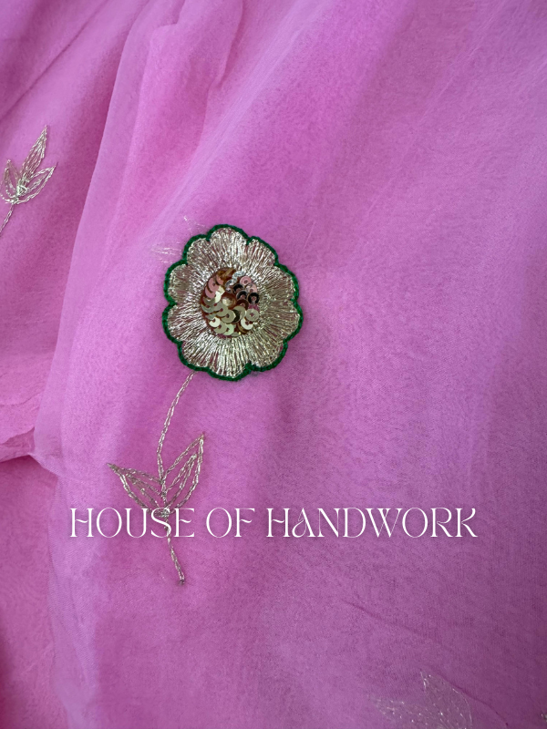 Step into elegance with the Pink Meadow Chiffon Saree, a delightful blend of grace and charm. Draped in a soft pink hue, this saree blooms with delicate floral sequin embroidery, giving it a refreshing and feminine allure. The intricate floral motifs, highlighted with shimmering sequins and threadwork, add a subtle sparkle that enhances its beauty without overpowering its elegance.