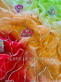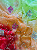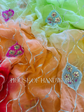 Crafted from lightweight chiffon, this saree drapes gracefully and feels effortless for long hours of wear. Whether styled for weddings, festive gatherings, or evening celebrations, its bold color play and handcrafted details make it an irresistible choice for women who love statement-making elegance.