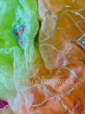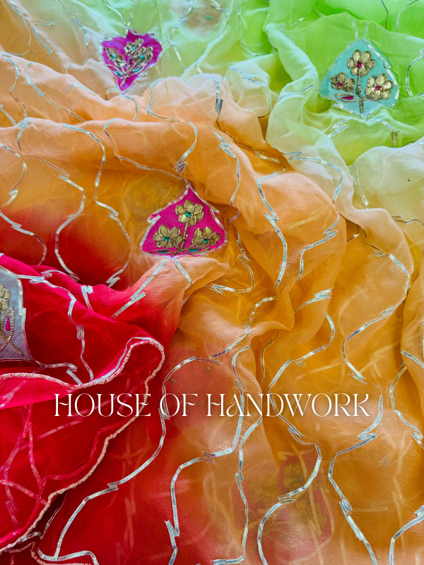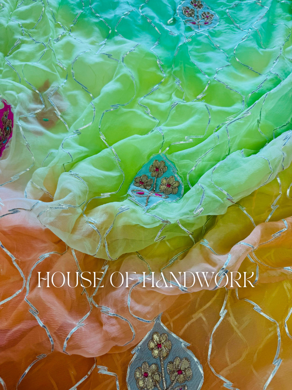 Step into vibrant elegance with the Radiant Waves Gotta Patti Chiffon Saree, a dazzling creation that blends tradition with a burst of modern colors. Designed with a striking ombré effect that flows seamlessly from lush green to soft orange and radiant red, this saree captures the joy and vibrancy of festive celebrations. The delicate chiffon base is adorned with silver wave embroidery, further enhanced by floral leaf-shaped motifs embellished with golden sequins and threadwork.