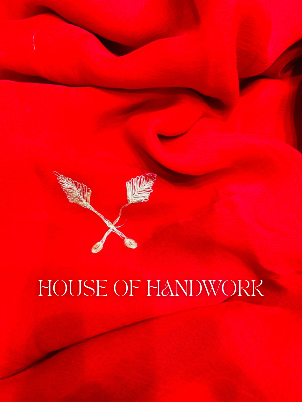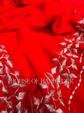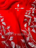 The delicate vine and floral motifs shimmer with silver and golden accents, adding a graceful contrast to the vibrant red fabric. Each detail is meticulously handcrafted by skilled artisans, making this saree not just an outfit, but a piece of heritage art.