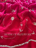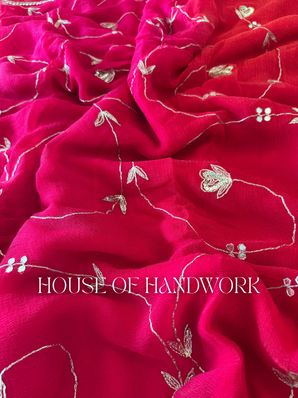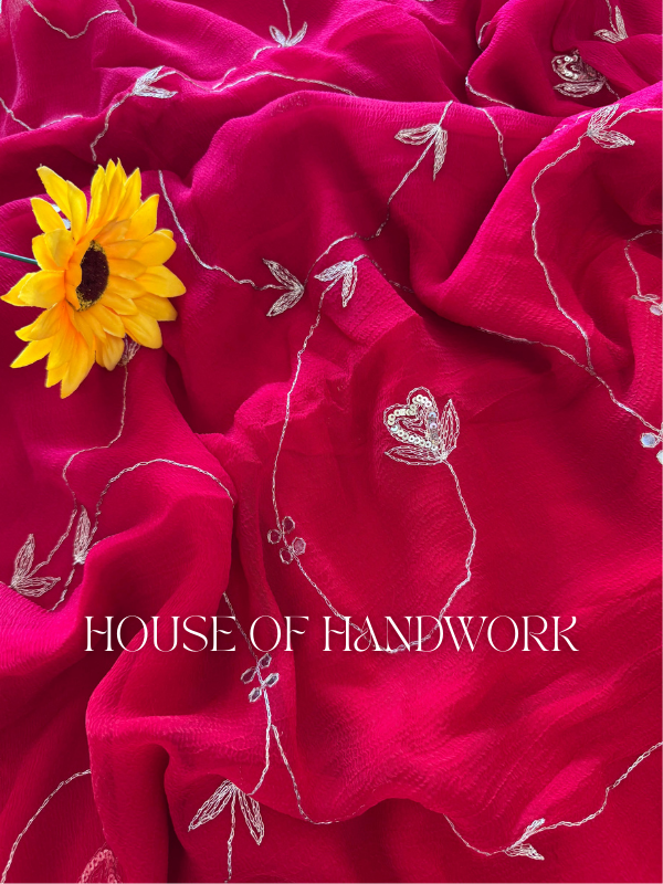 Radiate elegance with the Ruby Bloom Sequins Work Chiffon Saree. Crafted in a rich ruby-pink base, this saree is delicately adorned with shimmering sequin accents and floral-inspired hand embroidery. The flowing vines and dainty motifs, highlighted with sparkling details, create a graceful play of texture and shine, making it the perfect balance of subtlety and glamour.