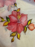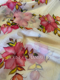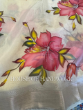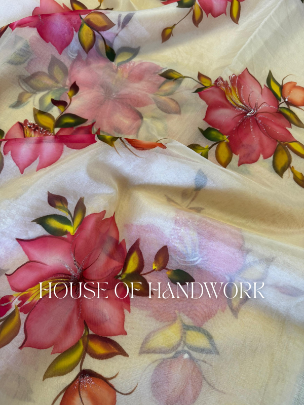Exude timeless elegance with the Scarlet Charm Foil Work Hand Painted Saree. Set on a soft cream chiffon base, this saree features bold scarlet-red floral motifs hand-painted with intricate detailing, paired with golden-green leaves for a radiant finish. Delicate foil shimmer enhances the blossoms, adding a festive sparkle that elevates its beauty.
