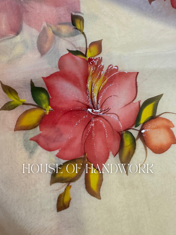 Work: Hand-painted floral motifs with foil shimmer highlights