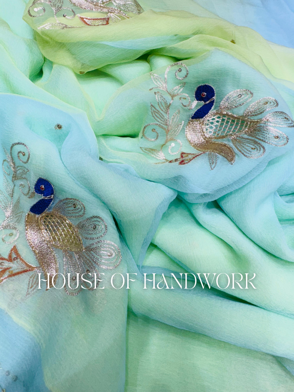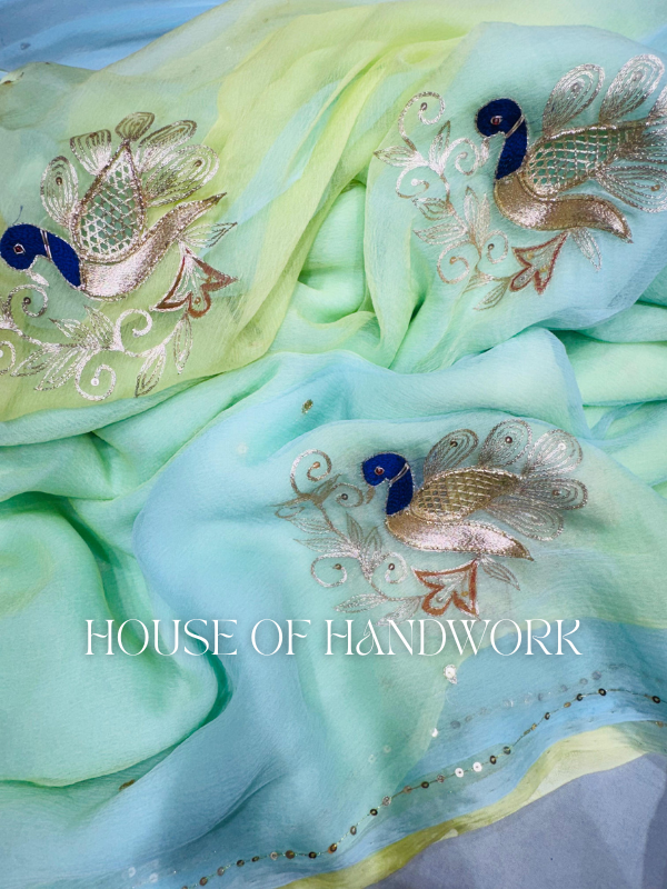 Work: Traditional Gota hand embroidery with intricate peacock motifs