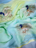 Step into timeless elegance with the Serene Peacock Gota Handcrafted Saree, a true masterpiece of artistry and tradition. Crafted on a soft aqua-green chiffon base, this saree is adorned with exquisite hand-done gota work, beautifully highlighting the majestic peacock motifs. Each detail shimmers with finesse, making it a statement piece for festive occasions, weddings, or grand celebrations.