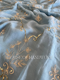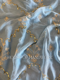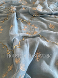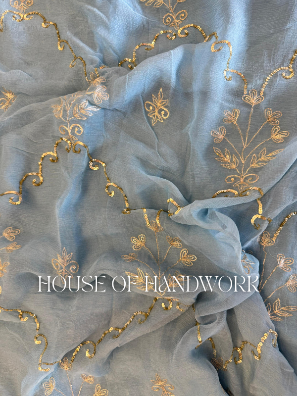 Adorned with intricate golden sequin embroidery in floral and vine patterns, the saree captures light with every movement, adding a touch of sparkle to its serene base. The combination of minimal shimmer with the airy drape makes it a versatile choice — equally perfect for festive gatherings, cultural celebrations, or evening soirées.