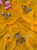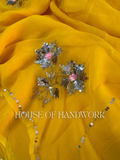 Radiate festive elegance with the Sparkling Sunrise Shaded Chiffon Saree. Drenched in a vibrant mustard-yellow hue reminiscent of the first light of dawn, this saree is adorned with intricate sequin floral embroidery in shimmering gold and silver, highlighted by delicate pink accents. The play of light across the embellishments creates a dazzling yet graceful charm.