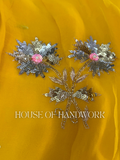 Work: Sequin floral embroidery in gold, silver, and pink accents
