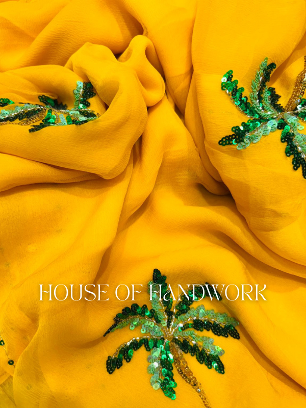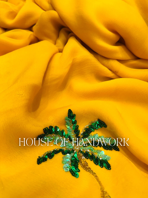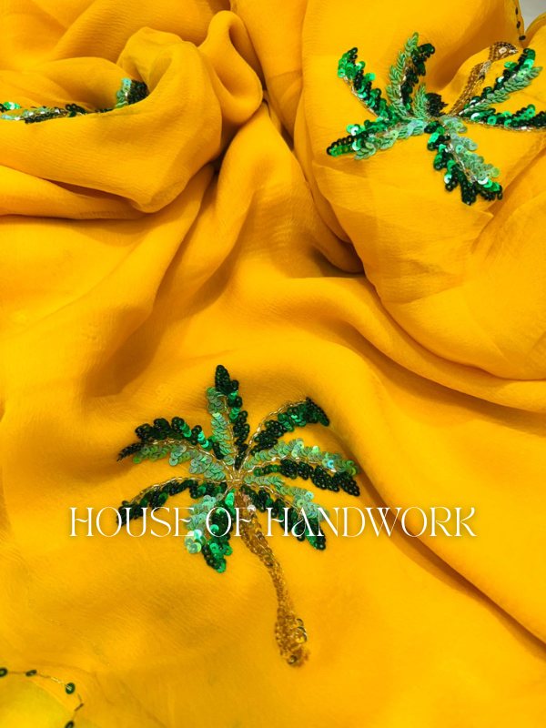 Step into the spotlight with the Sunlit Palm Sequin Embellished Saree, a radiant blend of tropical charm and artisanal elegance. Crafted on a bright sunshine-yellow base, this saree is adorned with hand-embroidered palm motifs brought to life with glistening green sequins. The playful yet luxurious detailing captures the essence of a tropical escape, making it a perfect statement piece for festive celebrations, destination weddings, or evening soirées.