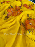 Designed in lightweight chiffon, it drapes beautifully and ensures effortless comfort throughout the day. Perfect for weddings, festive events, or cultural gatherings, this saree combines the warmth of sunshine tones with the elegance of hand-painted artistry.