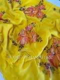 Brighten up every occasion with the Sunshine Bloom Foil Work Hand Painted Saree. Crafted on a radiant yellow chiffon base, this saree is adorned with striking orange hand-painted floral motifs, highlighted with delicate foil shimmer at the centers. The vibrant hues and intricate detailing create a lively, festive charm that makes this saree a true statement piece.