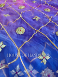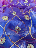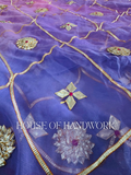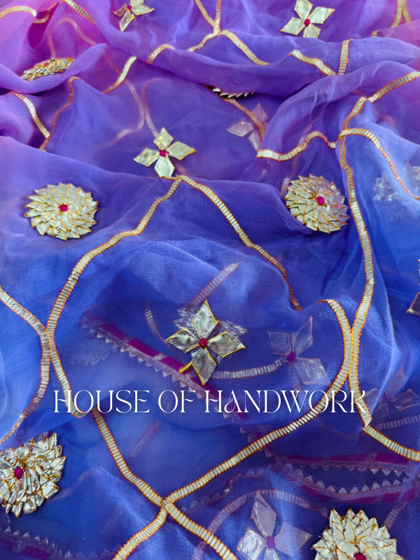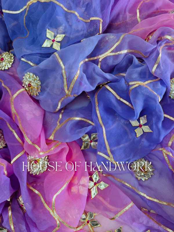 Step into regal charm with the Twilight Bloom Gota Patti Chiffon Saree, a stunning drape that captures the magic of twilight skies. Crafted on a luxurious chiffon base in enchanting purple and pink ombré shades, this saree is elevated with intricate golden gota patti work. The saree features radiant floral and star-shaped motifs, each accentuated with delicate detailing and a hint of festive sparkle.