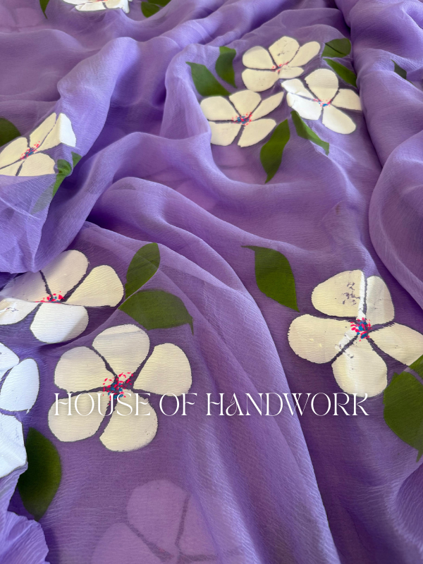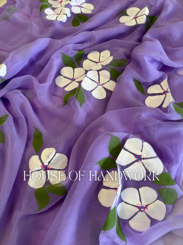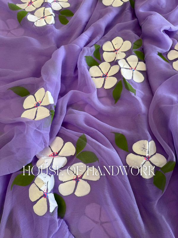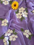 Celebrate artistry and elegance with the Violet Grace Handcrafted Floral Chiffon Saree. Draped in a soothing lavender base, this saree features delicately hand-printed white floral motifs with green leafy accents, adding a refreshing charm to its graceful appeal. Each flower is detailed with a hint of color at the center, giving the saree a vibrant, handcrafted finish that makes it truly unique.